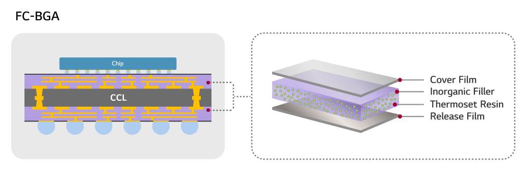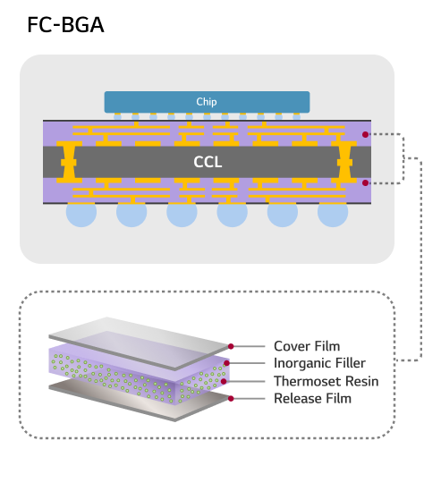 BUF(Build up Film)은 FC-BGA 등 고성능 반도체 기판의 다층 구조에서 층간 절연층을 형성하는 데 사용되는 필름 형태의 고절연 소재로, 균일하고 안정적인 절연층을 기반으로 고밀도 배선 형성, 신호 전송 품질 향상, 기판 안정성 확보 등 고성능 반도체 패키지 구현에 필수적인 역할을 합니다.
