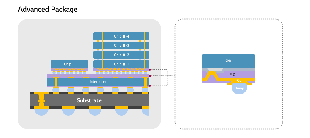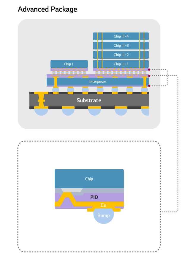 AI 기술 고도화로 첨단 반도체 성능 향상에 대한 수요가 급증하는 가운데, LG화학은 초미세 회로 구현에 필요한 고해상도 패터닝 특성과 우수한 신뢰성을 갖춘 PID를 제공하고, 액상 및 필름 기반의 폭넓은 제품 라인업을 통해 고객의 공정 조건과 기술적 과제에 최적화된 소재 솔루션을 제시합니다.